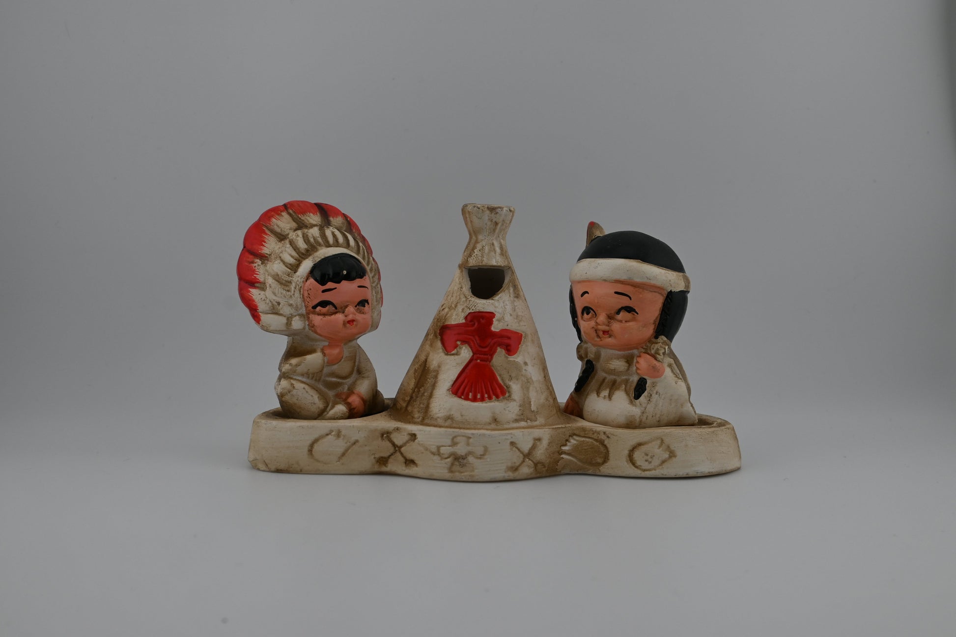 Vintage 1950s Ceramic American Indian Salt and Pepper Shaker Set With Teepee Toothpick Tray