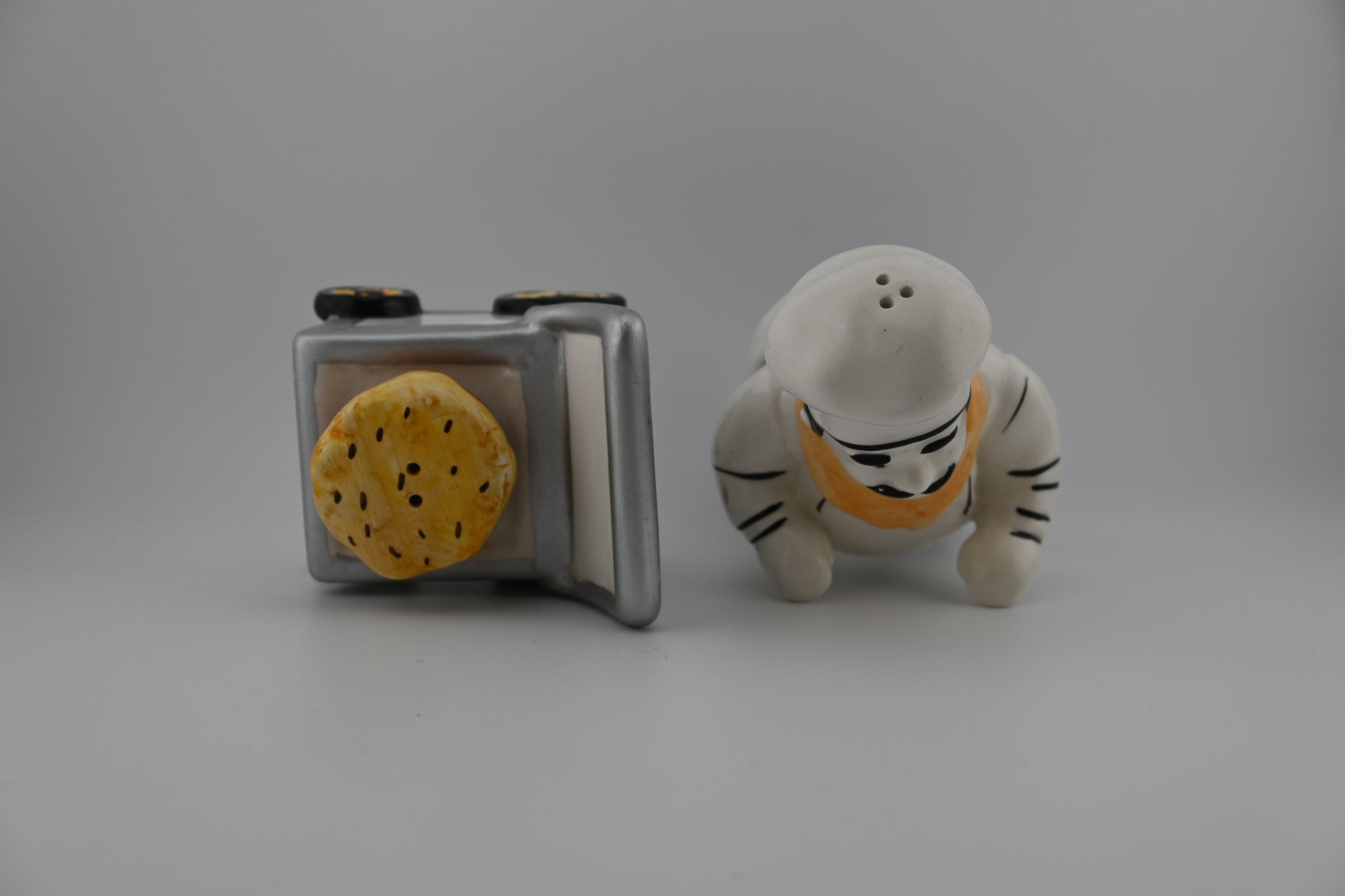 Bring a touch of culinary charm to your kitchen with these delightful vintage salt and pepper shakers, featuring a whimsical French chef and his bakery cart. Perfect for adding a playful yet elegant flair to your table, this novelty set captures the essence of a classic French patisserie.