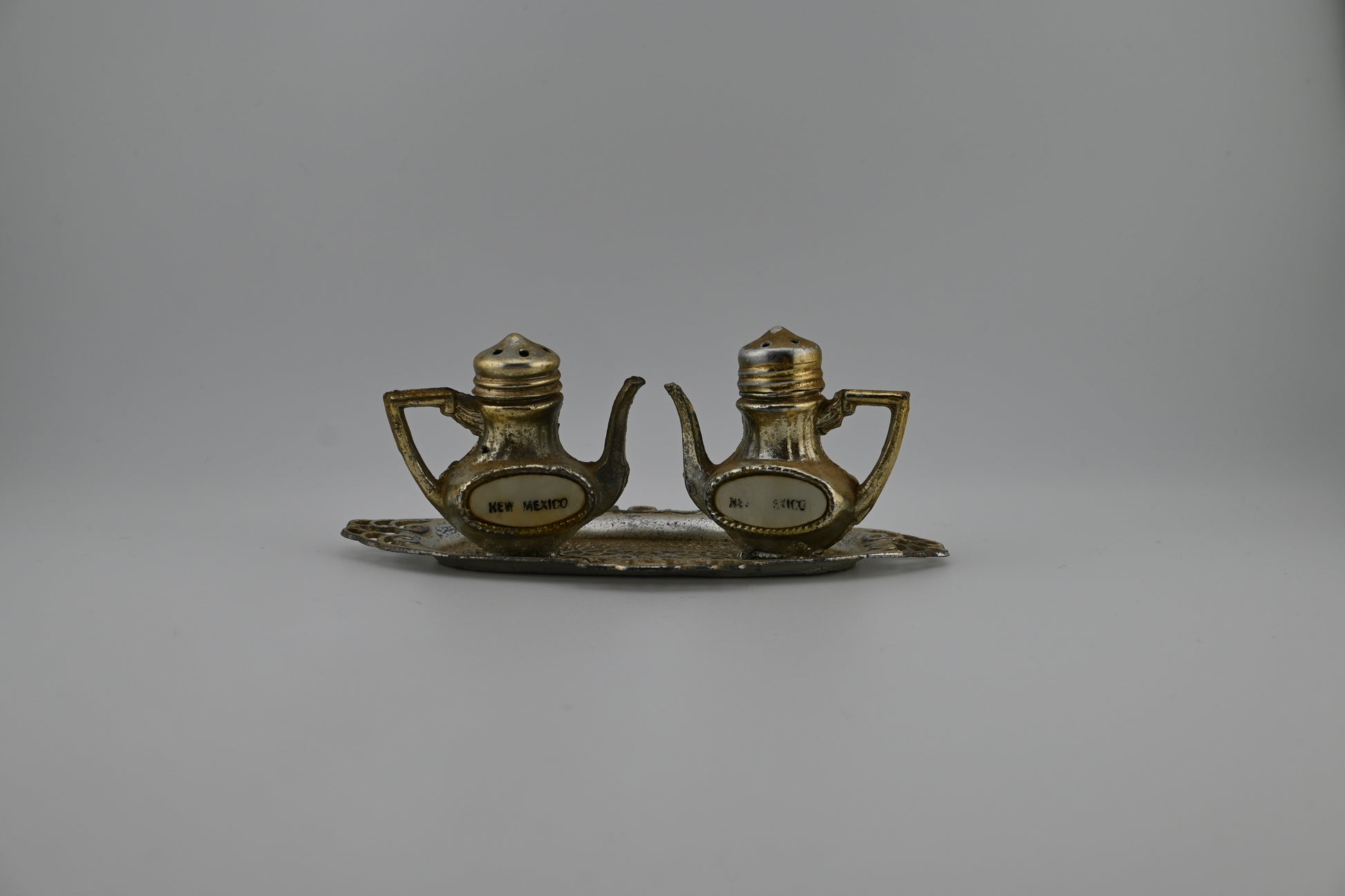 Elevate your tabletop decor with a slice of mid-century charm and southwestern flair with this Vintage New Mexico Salt & Pepper Shakers Set. Produced in Japan during the 1960s, this unique set features metal teapot-shaped shakers, each adorned with distinctive New Mexico designs.